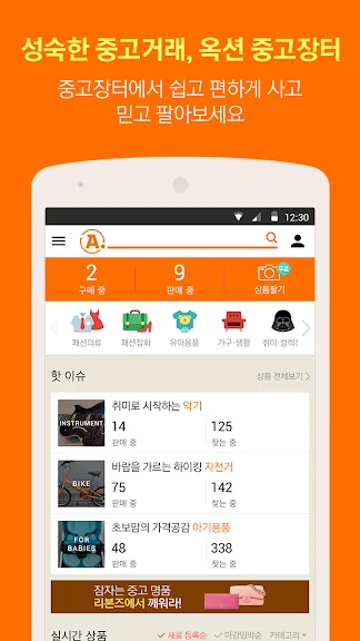 중고거래 : 디지털, 가전, 가구, 인테리어, 유아동, 유아도서, 육아용품, 생활, 가공식품, 여성의류, 여성잡화, 뷰티, 미용, 남성패션, 남성잡화, 스포츠, 레저, 게임, 취미, 도서, 티켓, 음반, 반려동물용품, 기타 중고물품, 삽니다