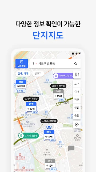 또한, 360도 VR로 매물의 생생한 현장을 확인할 수 있어 시간과 노력을 절약할 수 있습니다. 초등학교 통학구역을 고려한 매물 검색 기능도 있어, 학군을 중요하게 여기는 사용자들에게 유용한 정보를 제공합니다.