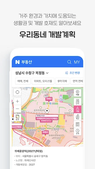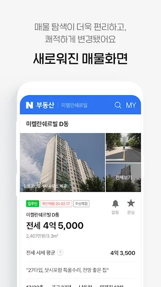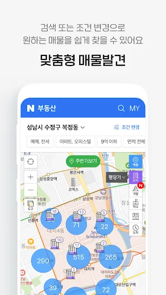 매물 주변의 편의시설 정보도 한눈에 확인할 수 있어, 마트나 병원 등 필수 시설이 가까운지 쉽게 파악할 수 있습니다. 중복된 매물은 그룹화되어 가격 비교가 간편해졌으며, 관심지역과 매물 정보를 'MY 부동산 홈'에서 쉽게 관리할 수 있습니다.
