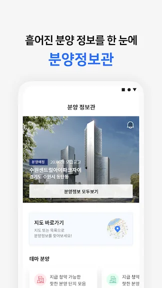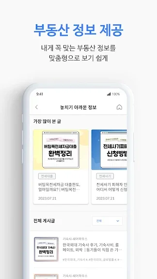 분양 정보관에서는 전국 분양 뉴스와 청약 가이드를 제공하여, 분양에 대한 모든 정보를 한곳에서 얻을 수 있습니다. AI 분석을 통해 매물의 거래 안전도까지 확인할 수 있는 기능도 제공됩니다.