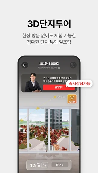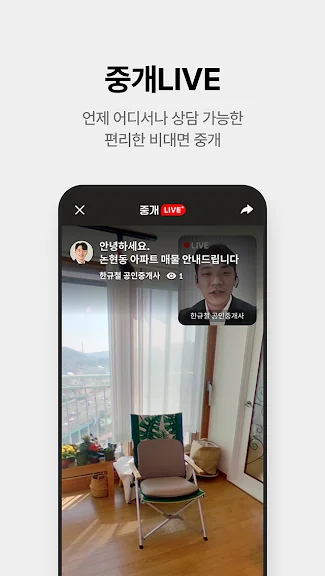 비대면 상담 기능인 중개라이브를 통해 집을 직접 보지 않아도 시간과 장소에 구애받지 않고 원하는 매물을 상세히 알아볼 수 있습니다. 또한, 3D 단지 투어와 VR 홈투어로 집안 구석구석을 실감 나게 확인할 수 있습니다.