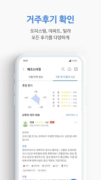 거주 후기와 실거래가뿐만 아니라, 층간소음, 관리비, 집주인에 대한 정보 등 실질적인 거주 경험을 바탕으로 한 다양한 리뷰도 확인할 수 있습니다. 이를 통해 더 안전하고 만족스러운 주거 환경을 선택할 수 있습니다.