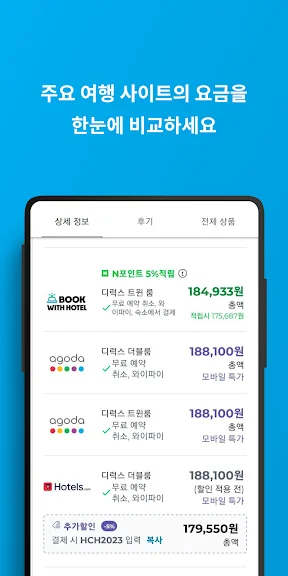 이 앱은 단순히 가격 비교만 제공하는 것이 아니라, 최저가에 추가 적립과 할인 혜택도 함께 제공하여 여행 비용을 절감할 수 있는 기회를 제공합니다. 또한, 네이버페이 적립 혜택까지 적용되어 더욱 알뜰하게 여행을 준비할 수 있습니다.