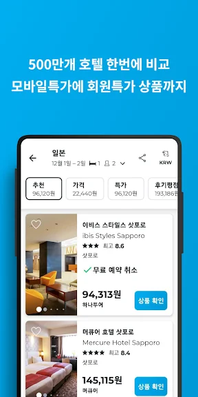 앱 내 주요 기능으로는 호텔 가격을 한 번에 비교하는 것뿐만 아니라, 전 세계 항공편과 렌터카를 검색하고, 내 위치 기반의 호텔 예약도 가능합니다. 직관적인 인터페이스와 다양한 숙소 유형 제공, 생생한 이용 후기와 이미지가 함께 제공되어 원하는 숙소를 쉽게 선택할 수 있습니다.