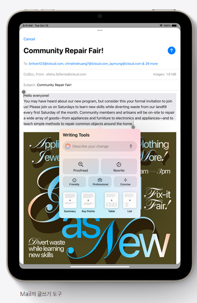 아이패드 미니는 Apple Intelligence 기능을 통해 사용자에게 개인화된 경험을 제공합니다. 이 기능은 사용자의 행동 패턴과 필요를 학습하여 상황에 맞는 최적의 결과를 제시하며, 이를 수행하는 동안 개인 정보 보호를 철저히 유지하는 것이 특징입니다. 예를 들어, 텍스트 작성 시 오타를 교정하거나 선택한 텍스트를 간편하게 요약해주는 기능은 생산성과 편의성을 크게 향상시킵니다.