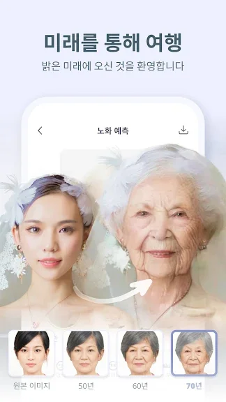 오래된 카메라는 단순한 사진 앱이 아닙니다. 시간 여행을 떠나는 듯한 놀라운 경험을 선사하는 특별한 기능이 가득합니다. 자신의 사진을 업로드하면 10년, 20년, 30년 후의 모습을 예측하여 보여줍니다. 미래의 나를 미리 만나볼 수 있는 흥미로운 기능으로 즐거움을 선사합니다.
