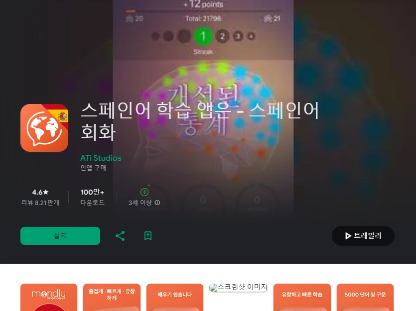이 어플은 구글플레이스토어에서 "스페인어 회화 배우기"로 검색했을때 5번째로 나오는 어플입니다. 아래는 스페인어 학습 앱은 - 스페인어 회화 어플에 대한 자세한 설명이니 참고하세요.
