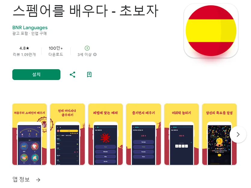 이 어플은 구글플레이스토어에서 "스페인어 회화 배우기"로 검색했을때 4번째로 나오는 어플입니다. 아래는 스펨어를 배우다 - 초보자 어플에 대한 자세한 설명이니 참고하세요.