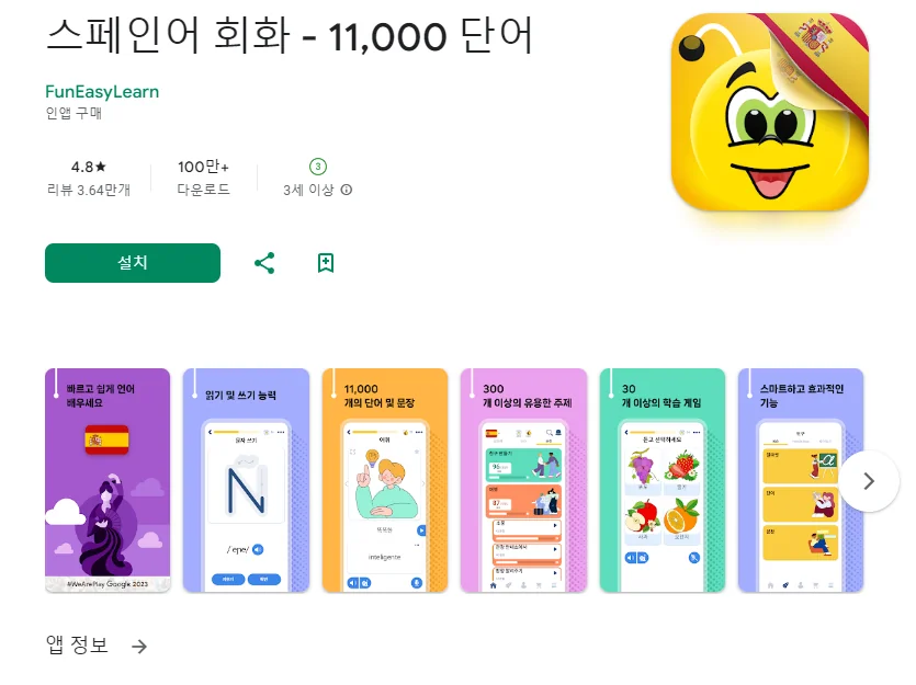이 어플은 구글플레이스토어에서 "스페인어 회화 배우기"로 검색했을때 2번째로 나오는 어플입니다. 아래는 스페인어 회화 - 11,000 단어 어플에 대한 자세한 설명이니 참고하세요.