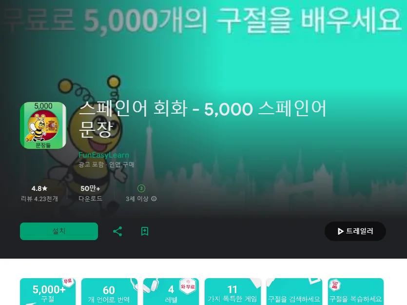 이 어플은 구글플레이스토어에서 "스페인어 회화 배우기"로 검색했을때 1번째로 나오는 어플입니다. 아래는 스페인어 회화 - 5,000 스페인어 문장 어플에 대한 자세한 설명이니 참고하세요.