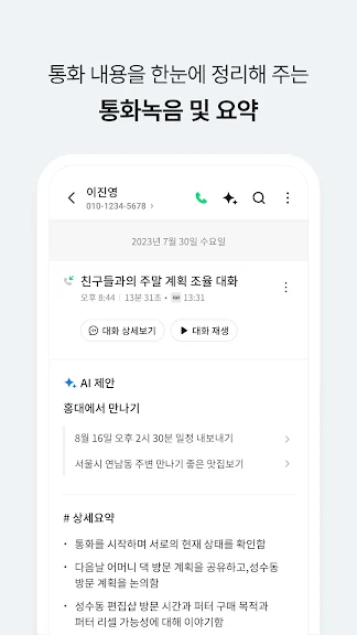AI가 추천하는 대화 주제를 볼 수 있고 통화 직후 방금 한 통화 내용을 요약하고 통화에서 언급된 할일과 일정을 카드 형태로 모아서 알려줍니다.