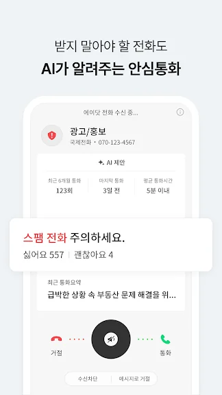 AI로 업그레이드 되어 아직 신고되지 않은 최신 피싱/스팸 번호도 실시간으로 탐지해서 알려주고 자동으로 차단해드려요.