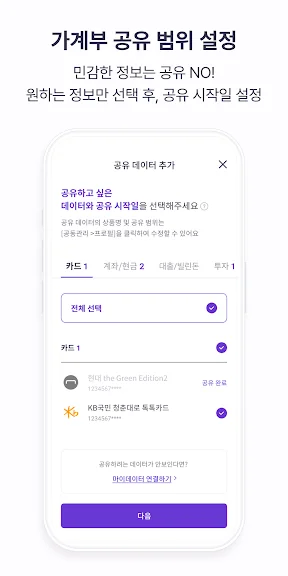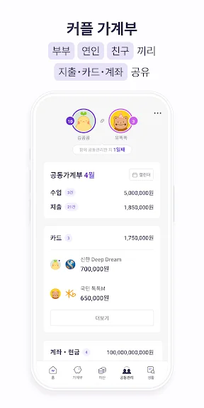 - 부부, 연인, 친구 끼리 서로 연결하여 목적에 따라 선택적으로 지출/카드/계좌를 공유할 수 있어요