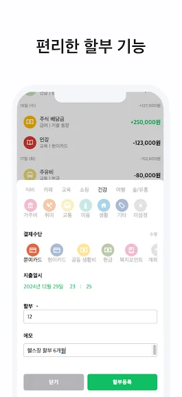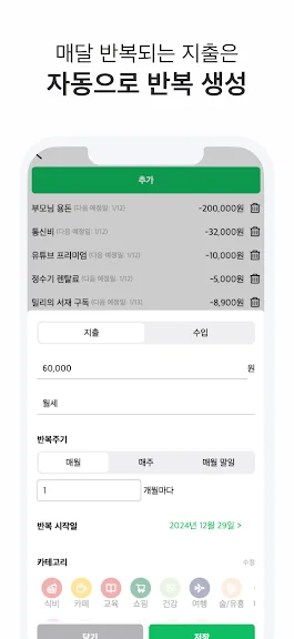 - 매일, 매주, 매월 언제든지 원하는 날짜에 자동으로 반복 및 할부 입력할 수 있습니다.