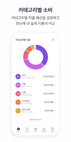 - 어디에 주로 돈을 쓰고 있는지 카테고리별 지출을 한눈에 확인하고 예산을 설정하여 관리할 수 있어요