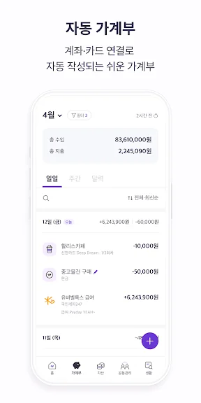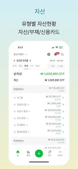 - 현금, 통장, 체크카드, 신용카드로 나눠서 자산을 관리할 수 있습니다.