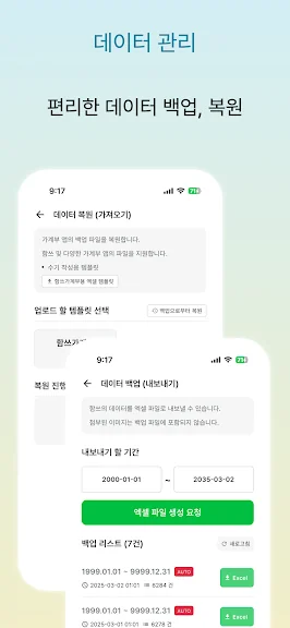 설정 - 백업/복원에서 데이터 백업/복원 기능을 지원합니다. 이메일로 백업파일 내보내기가 가능하며, 휴대폰에 저장도 가능합니다. 외부 백업 설정을 통해 자동 백업 기능도 함께 지원하고 있습니다.
