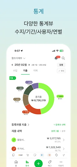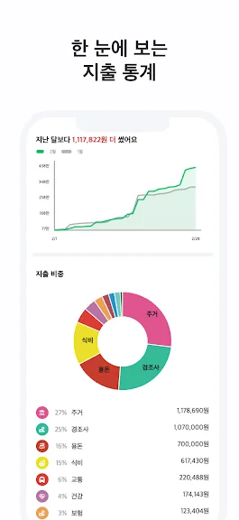 - 자산, 카테고리, 금액별로 나눠서 통계를 확인할 수 있습니다.
