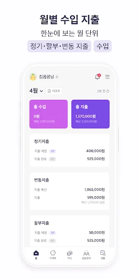 - 월간 수입, 정기/변동/할부 지출의 요약정보를 쉽게 확인할 수 있어요