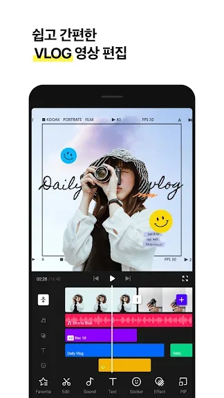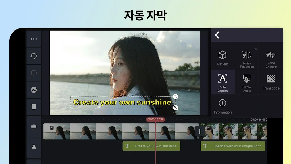 컷분할, 자막, 스티커, 배경음악, 효과음 및 트랜지션 등을 사용해 자유롭게 원하는 영상을 연출해보세요.