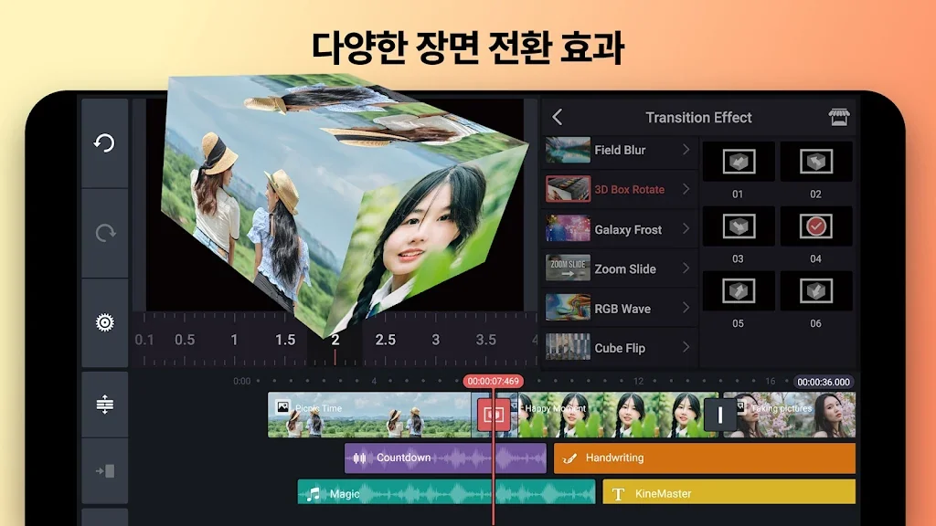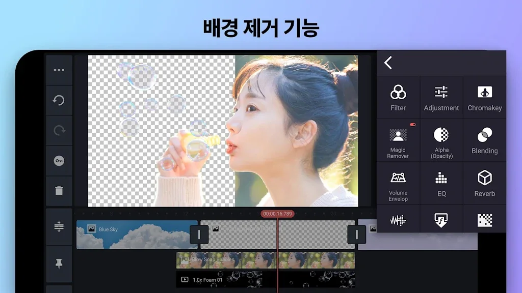 키프레임 애니메이션, 크로마키(그린 스크린), 속도 제어(슬로우 모션, 타임 랩스)등의 고급 비디오 편집 기능과 배경 제거(AI 누끼), AI 스타일, 자동자막등의 인공지능 기능들을 제공하는 KineMaster야말로 동영상 편집, 뮤직 비디오 편집, 브이로그 편집, 애니메이션 제작을 원하는 분들에게 최고의 선택이 될 것입니다.