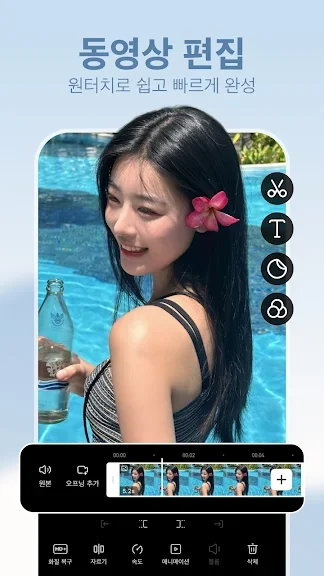 필터에서 몸매 보정까지. 동영상 편집으로 예쁘게 보정한 후에도 화질 저하는 걱정하지 마세요. 화질 복구로 예쁘고 또렷한 동영상 편집이 가능해요.