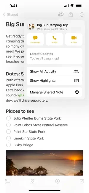 • 친구를 멘션하여 중요한 업데이트를 알림을 보내고 이를 공유 메모에 바로 링크할 수 있습니다.