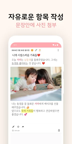 일일 알림: 매일 일기쓰기를 권장하는 알림을 설정하여, 꾸준한 일기 작성 습관을 형성하세요.
