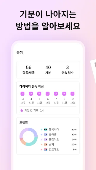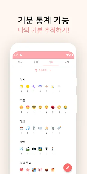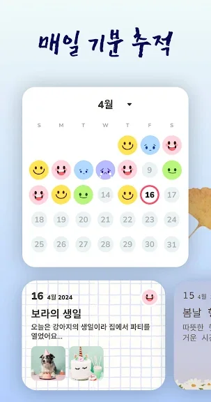 기분 추적기: 일기장 기분 추적을 통해 매일의 감정을 기록하고, 감정일기를 사용하여 기분 변화를 분석하세요.