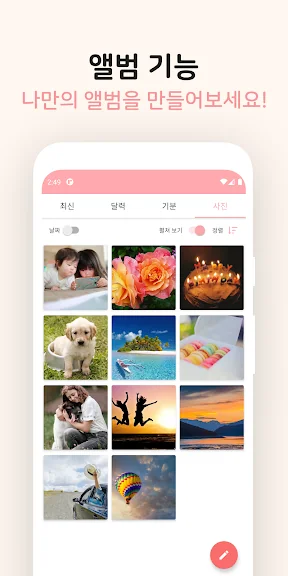 갤러리에서 사진을 추가하거나 웹에서 저장한 이미지를 업로드하여 사진 일기를 만들 수 있습니다. 블로그처럼 글 사이에 사진을 배치할 수 있습니다.