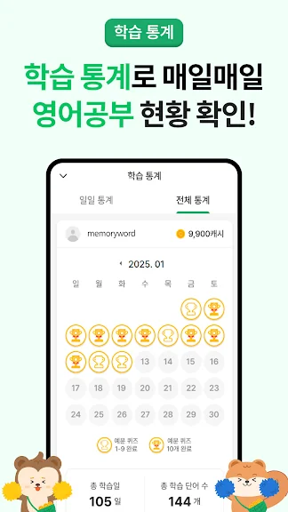 - 학습통계에서 총 학습일과 학습 영단어 수를 한 눈에 확인해보세요.