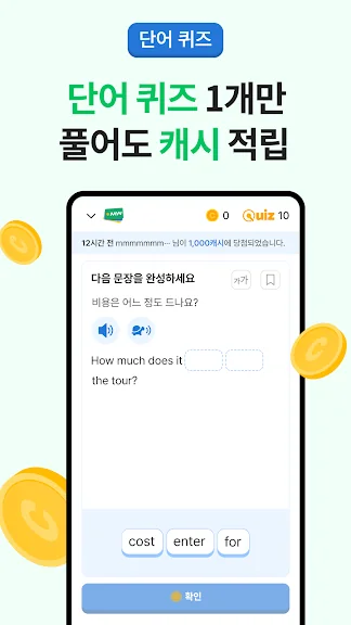 - 영단어 퀴즈를 풀고 정답을 맞히면 기프티콘으로 교환 가능한 캐시가 지급됩니다.