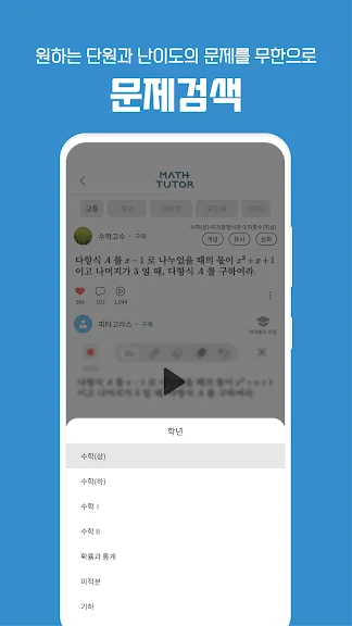 스마트폰으로 원하는 " 학년/과목 - 대단원 - 중단원 - 난이도 설정하면 충분한 문제들을 무료로 제공