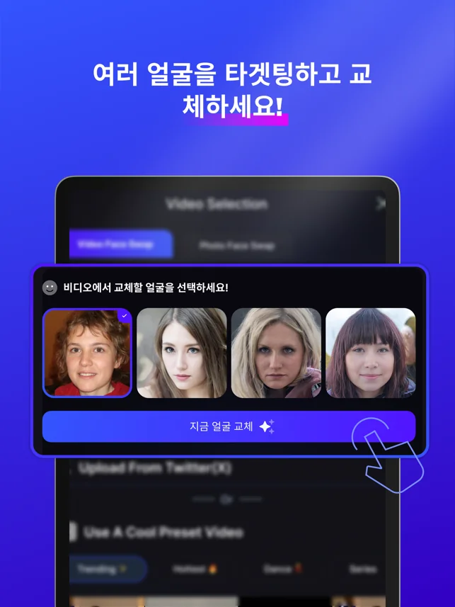 얼굴 교체 사진/동영상의 얼굴을 한 번 탭으로 교체하세요! 우리의 발전된 AI는 자연스러운 표정과 움직임을 유지합니다 - 편집 기술이 필요하지 않습니다.