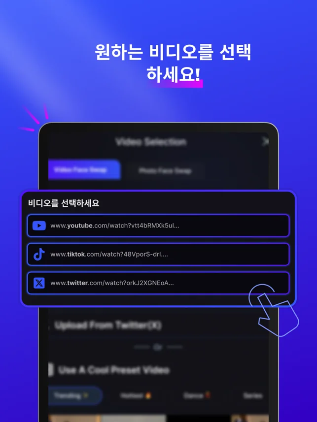 맞춤형 업로드 옵션: 갤러리에서 직접 영상 업로드하거나, YouTube, TikTok, X 링크 삽입도 가능