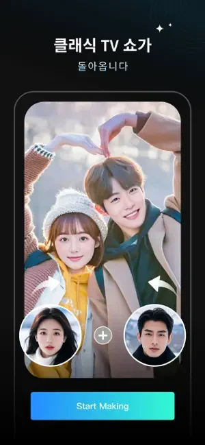 쉽죠! 사진을 업로드하고 마음에 드는 연예인을 선택하면 끝! 순식간에 장면에 매끄럽게 합쳐져, 준비된 포트라이트를 훔치러 나가게 될 것입니다. 상상력을 마음껏 발휘하며 즐거운 시간을 보내세요!