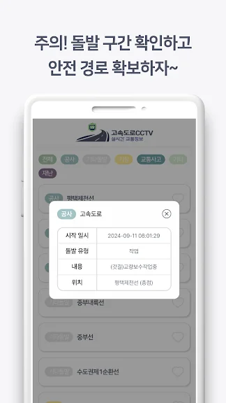 아래는 고속도로 상황대응 어플에 대한 스크린샷 정보입니다.