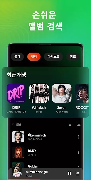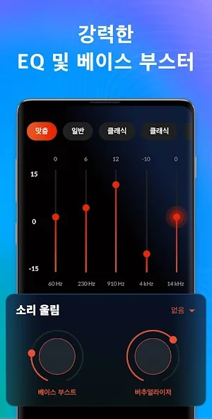 세련된 디자인과 사용자 맞춤 배경으로 나만의 음악 감상 공간을 꾸밀 수 있어요. 강력한 이퀄라이저 덕분에 음악의 분위기를 취향에 맞게 조절하는 것도 어렵지 않답니다.