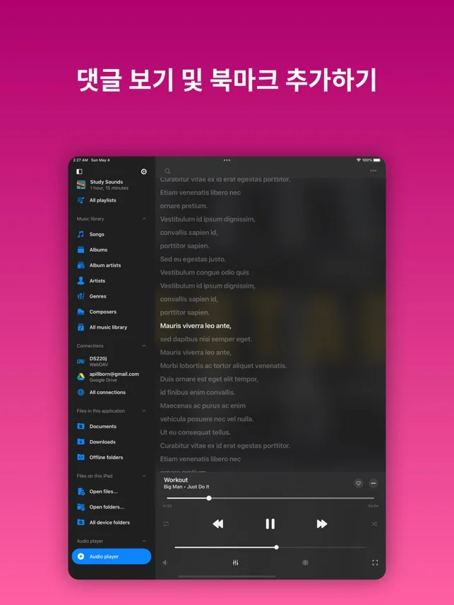 디자인이 깔끔하고 직관적이라서, 처음 사용하는 분들도 부담 없이 쓸 수 있어요. 스마트 재생 목록이나 잠금 화면 제어까지 지원해서, 일상 속에서 음악과 더 가까워질 수 있답니다.