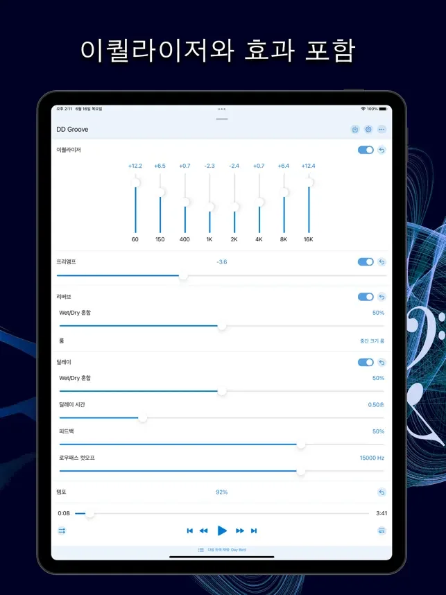 또한, 내장된 이퀄라이저는 베이스 부스트나 리버브 같은 효과를 손쉽게 조절할 수 있어, 듣는 음악의 분위기를 원하는 대로 만들어줄 수 있어요. 좋아하는 노래를 더 풍부하게 즐기고 싶을 때 딱인 기능이죠.