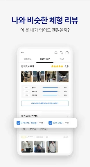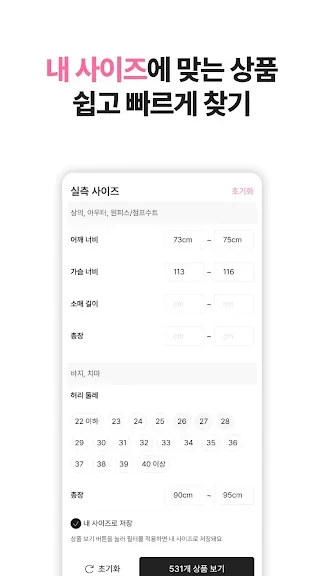 - 내 사이즈만 보기: 가슴너비, 어깨너비, 허리단면 등 실측 사이즈로 옷을 필터링하고 내 사이즈에 맞는 옷만 살펴볼 수 있어요