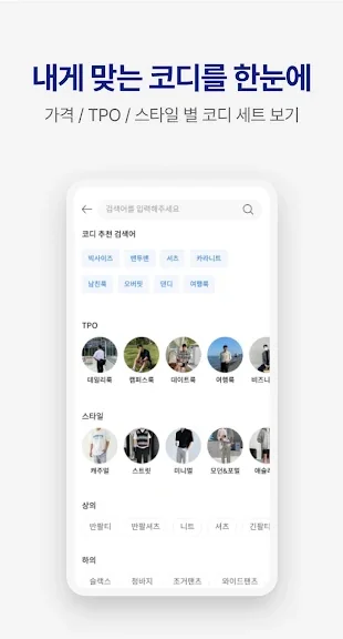 - 색상, 스타일, TPO, 종류, 가격 등에 맞는 코디를 쉽게 찾을 수 있어요.