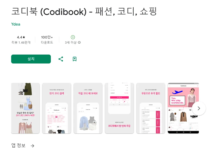 이 어플은 구글플레이스토어에서 "코디"로 검색했을때 1번째로 나오는 어플입니다. 아래는 코디북 (Codibook) - 패션, 코디, 쇼핑 어플에 대한 자세한 설명이니 참고하세요.