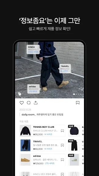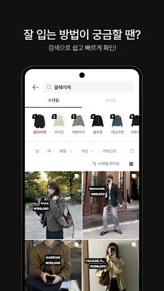 미니멀, 캐주얼, 비즈니스룩, 스트릿, 유니크, 러블리 패션까지 내가 원하는 스타일로 정렬하고 인스타처럼 편하게 옷 구경하세요! 맘에 드는 코디나 제품은 즉석에서 바로 구매 가능!